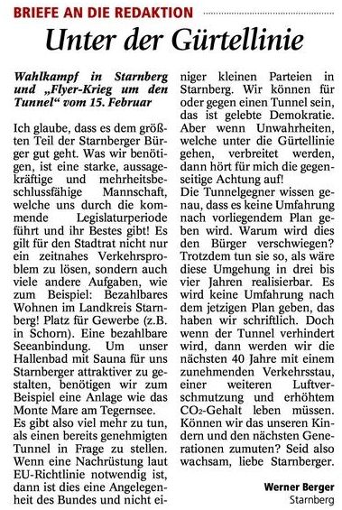 Stichworte: Tunnel Starnberg  |  Abluft |  Verkehrspläne  |  Naturschutz  |  Stau in Starnberg  |  Verkehrsdichte  |  Zeitplan  |  Finanzierung |  Verkehrskonzepte | FFH | Naturschutzgebiete Starnberg | Radwegekonzepte | Umgehung | B2 Tunnel | Sicherheit | Druchgangsverkehr | Nordportal | Südportal | Bauzeit | Energiebilanz | Chronologie | Busfahrpläne | Mobilität | Sanierungskonzept | Stadtentwicklung | Westumfahrung | Maxhof B2 | Karten und Pläne | Downloads